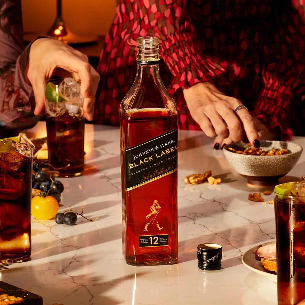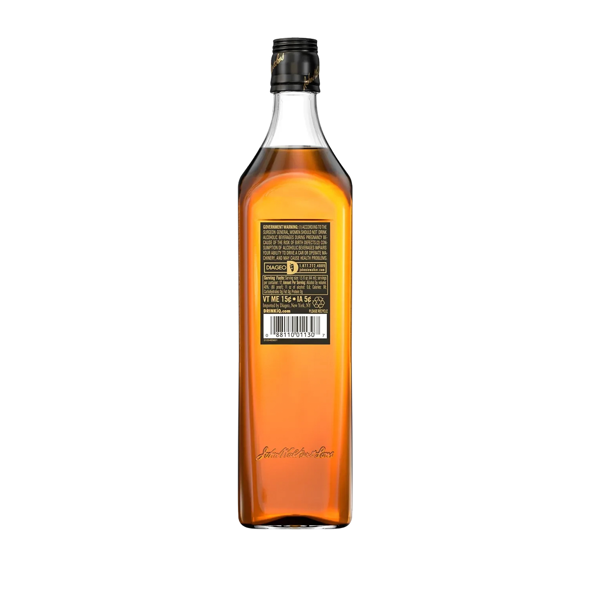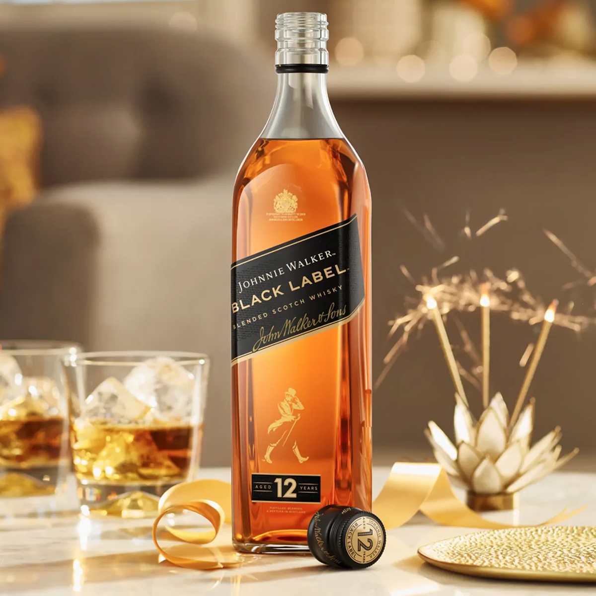 Johnnie Walker Black Label is a blended Scotch whisky that is the result of combining single malt and grain whiskies, all aged for at least 12 years. It is known for a deep, smooth, and complex flavor profile with notes of sweet fruit, vanilla, creamy toffee, and a distinctive smoky undertone. It is versatile and can be enjoyed neat, with ice, or in cocktails.